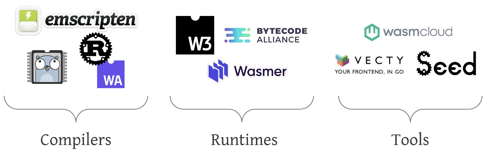 Tracing the WebAssembly dev lifecycle from human-readable code to applications (similar to my recent article about tools across the dev lifecycle), there are compilers, runtimes and higher-level tools. Compilers take code in most any programming language and translate it to machine code, optimizing along the way. Emscripten is the most popular compiler for C/C++. Rust is compiled to WebAssembly with a compiler of the same name. TinyGo is used for Golang.